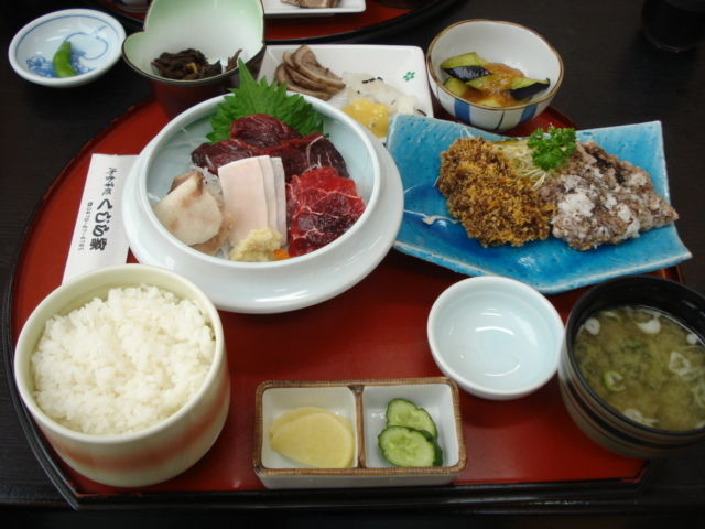 紅白の刺身、竜田揚げカツ、しっぽのからし酢味噌和えなどなど。